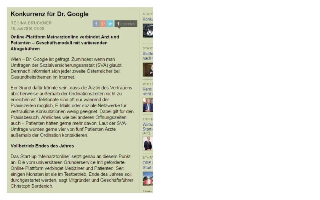 Konkurrenz für Dr. Google Der Standard berichten über MeinArztOnline. Konkurrenz für Dr. Google – Start up – derStandard.at › Wirtschaft Online-Plattform Meinarztonline verbindet Arzt und Patienten – Geschäftsmodell mit variierenden Abogebühren Hier gehts zum...